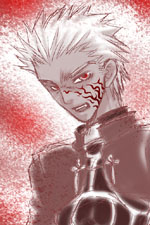 で、今回の絵は滅殺くん風のアーチャー、って事で。滅殺くんって何だよ!?ですね。ストZEROの殺意の波動に目覚めたリュウの事をこう呼んでたんですが、切れキャラです。そうなるとやはりアーチャーだよなーとか思って。そうしたら滅殺くん風アーチャーとランサーでマンガ描きたい気にね。