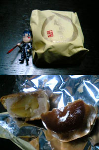 今日の画像はお気に入りの和菓子。地元のお店で売ってるものです。金、土、日曜日とセールで少々安くなってたので買ってきてもらいました。丸ごと一個の栗が入っております。しっとりですごく美味しいのですよ、これ。『越山栗』(えつざんぐり)と言いますじゃ。対比に頂き物の兄貴を。あまり大きさの目安になりませんね。栗丸ごと入ってるし、それなりに食べ応えあります。一個136円。セールで116円。栗って結構高いので意外とお手ごろ価格かと。