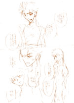 捏造弓槍ルート。何気に考えてても描けない長さ。うーんまとまりそうな気もするんだけど、時間と技術他色々足りませんよー。こういう時に小説が書けるとな、と思います。マンガと半々ならきっと完全版で出せると思う。…多分ですが。マンガ描くのとか色々ヘタですから、中々。気力も持たないような。長くなりそうだし。予想はいつも裏切るからあれですが、士槍ルートと同じくらいにはなりそうですよ。あれも予想外に長くなったしねェ。金槍分と士郎さん転落人生と。その辺も含め長そうだな。しかもENDは二つ欲しい。…本でやる事じゃないんだが。 捏造士槍ルートの反応が薄いしよくわからんのでますます進められない。シリアスとかって客観的に見れないしまったくわからん。伝わってんのか、とか悩んだらキリねーぞー。もんもんもん。 とりあえず、弓の人が槍の人に執着しまくってストーカーと化してるような話です。…ヒドイ。君は私のものだ!とか言ってヤラれちゃったりしても槍兵何も知らないからね。なにこの変態ストーカー!!怖ッ!!以外の何者でもないですよ。…ああ、ランサー可哀相。(ヒドイのは私ですよ、知ってますよそんな事。ヤダなぁ!) ああ、そう言えばこの弓槍ルート用の表紙のラフが数枚描き散らかされてるっけ。だいぶ前に描いてほったらかし。どれも内容的にハマってる気もするので勿体無い…とか思いつつ。日の目をどこかで見るのでしょうか。まずはそのラフを発掘しない事には。描き散らかしは山のようにあるので…。それも原稿用紙にも描いちゃったりするから勿体無い状態の原稿用紙も数十枚。